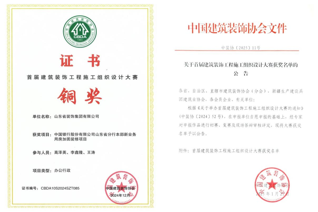 近日,省裝公司組織施工的“中國銀行股份有限公司山東省分行本部新業務用房加固裝修項目”摘獲首屆建筑裝飾工程施工組織設計大賽銅獎。本項賽事由中國建筑裝飾協會組織,是一項旨在提高裝飾行業施工組織水平,發揮科技創新在建筑裝飾行業中的引領和支撐作用,提高項目整體管理水平的重要賽事。 省裝公司承攬施工的中國銀行股份有限公司山東省分行本部新業務用房加固裝修項目于2021年投入施工,標段裝飾面積為16782.08㎡,工期總計151天,施工團隊從工程規范、裝飾效果及材料品質等各方面進行統籌調度,融合使用健康裝飾工藝,保障項目使用功能的同時,打造了健康綠色型的行政辦公環境,圓滿呈現設計對室內環境及整體觀感的規劃,在疫情防控期最大限度確保了現場施工有序穩定,工期目標順利完成。為充分彰顯省裝公司工程項目組織管理的卓越實力,本次參賽項目的施工組織人員高澤英、李鑫隆、王濤,對項目基本情況、工藝技術特點、施工難點及創新管理措施等進行了全面梳理,形成了極具指導和參照推廣意義的項目文件,充分體現了公司施工組織專業統籌能力。此前,該項目還榮獲了2023年度天津市建筑工程裝飾“海河杯”榮譽。